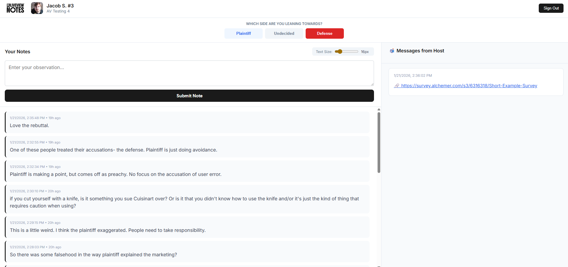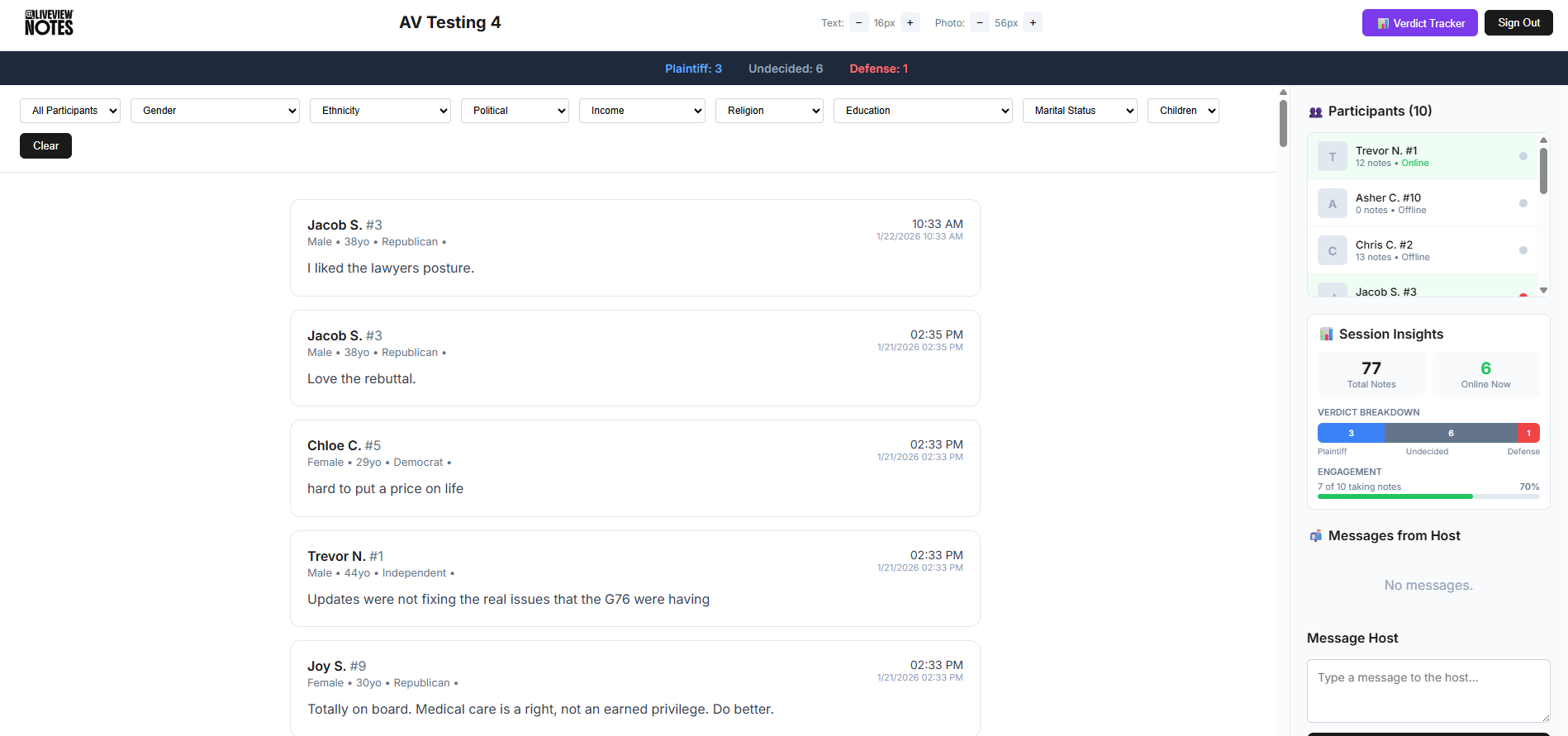 With LiveView® Notes, participants and observers log reactions as they occur—time-stamped, attributed, and structured. Opinion leanings (Plaintiff, Defense, Undecided) are tracked live, creating a dynamic view of persuasion and momentum throughout the session. This turns qualitative feedback into measurable movement—before the session even ends.
